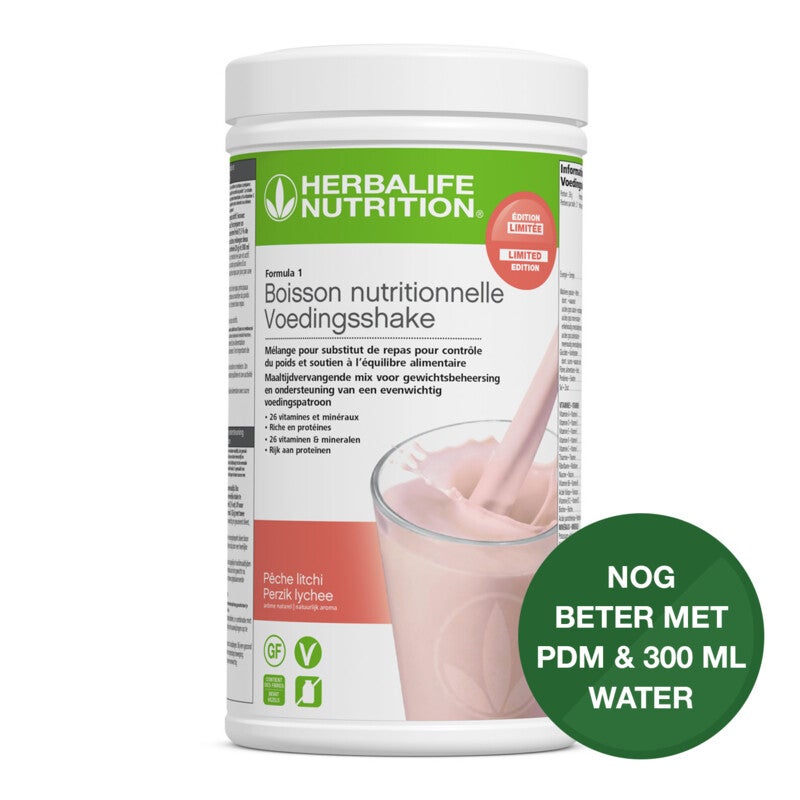- ·F1 Limited Edition Perzik Lychee is een veganistische en zuivelvrije shake wanneer je deze bereidt met verrijkte sojadrank of PDM (of PDM Vegan) en water.